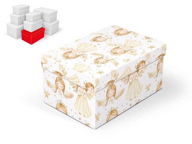 Vánoční dárková krabice o rozměrech 24 x 16 x 12 cm Vánoční dárková krabička je navržena v jemném motivu andílků a zlatých hvězdiček, který působí decentně a stylově. Díky svému vzhledu promění každý dárek v krásně zabalené překvapení, aniž by bylo potřeba další dekorace. Krabička tak šetří čas a přitom působí opravdu výjimečně. Po vložení do košíku se k objednávce automaticky přidává celá sada osmi krabiček v různých velikostech, všechny ve stejném designu. Samostatný prodej není možný – vždy jde pouze o kompletní balení celé sady. Set obsahuje tyto krabice: 5371308 Krabice dárková B-V011-A 16x10x8 cm 5371309 Krabice dárková B-V011-B 18x11x9 cm 5371310 Krabice dárková B-V011-C 20x12x10 cm 5371311 Krabice dárková B-V011-D 22x14x11 cm 5371312 Krabice dárková B-V011-E 24x16x12 cm 5371313 Krabice dárková B-V011-F 26x17x13 cm 5371314 Krabice dárková B-V011-G 28x18x14 cm 5371315 Krabice dárková B-V011-H 30x19x15 cm Uvedená cena je za 1 ks.