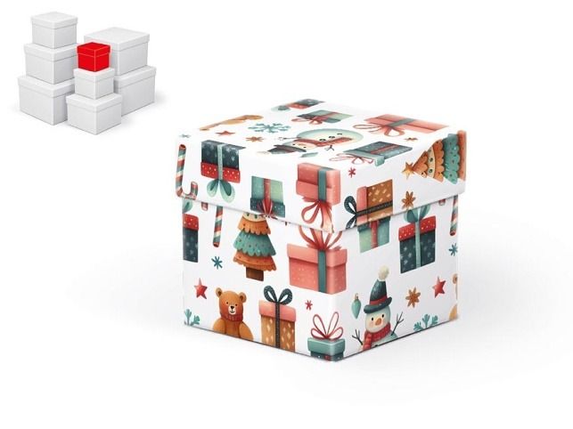 Vánoční dárková krabice o rozměrech 8 x 8 x 8 cm Vánoční dárková krabice je vyrobena z pevného kartonu a pokryta dekorativním papírem s vánočními motivy. Povrch krabice zdobí obrázky medvídků, dárků, vánočních stromečků, sněhuláků, cukrových hůlek a sněhových vloček. Barva pozadí je bílá, což vytváří krásný kontrast s barevnými motivy. Jejich slavnostní a elegantní vzhled je ideální pro balení vánočních dárků. Při vložení do košíku se automaticky vloží i ostatní krabičky, tak aby jste měli v košíku vždy celý, kompletní set. Materiál: 1,5 mm karton, potažený luxusním papírem SET OBSAHUJE TYTO KRABICE: 5371160 Krabice dárková C-V008-A 8x8x8 cm 5371161 Krabice dárková C-V008-B 10x10x9 cm 5371162 Krabice dárková C-V008-C 12x12x10 cm 5371163 Krabice dárková C-V008-D 14x14x11 cm 5371164 Krabice dárková C-V008-E 16x16x12 cm 5371165 Krabice dárková C-V008-F 18x18x13 cm 5371166 Krabice dárková C-V008-G 20x20x14 cm 5371167 Krabice dárková C-V008-H 22x22x15 cm Uvedená cena je za 1 ks.