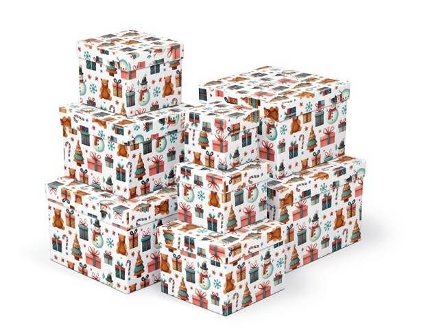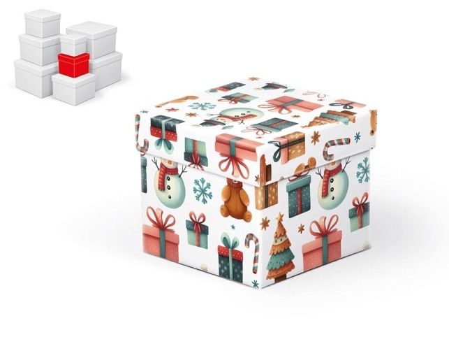 Vánoční dárková krabice o rozměrech 10 x 10 x 9 cm Vánoční dárková krabice je vyrobena z pevného kartonu a pokryta dekorativním papírem s vánočními motivy. Povrch krabice zdobí obrázky medvídků, dárků, vánočních stromečků, sněhuláků, cukrových hůlek a sněhových vloček. Barva pozadí je bílá, což vytváří krásný kontrast s barevnými motivy. Jejich slavnostní a elegantní vzhled je ideální pro balení vánočních dárků. Při vložení do košíku se automaticky vloží i ostatní krabičky, tak aby jste měli v košíku vždy celý, kompletní set. Materiál: 1,5 mm karton, potažený luxusním papírem SET OBSAHUJE TYTO KRABICE: 5371160 Krabice dárková C-V008-A 8x8x8 cm 5371161 Krabice dárková C-V008-B 10x10x9 cm 5371162 Krabice dárková C-V008-C 12x12x10 cm 5371163 Krabice dárková C-V008-D 14x14x11 cm 5371164 Krabice dárková C-V008-E 16x16x12 cm 5371165 Krabice dárková C-V008-F 18x18x13 cm 5371166 Krabice dárková C-V008-G 20x20x14 cm 5371167 Krabice dárková C-V008-H 22x22x15 cm Uvedená cena je za 1 ks.