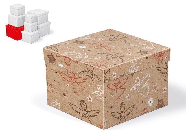 Vánoční, dárková krabice o rozměrech 20 x 20 x 14 cm Dárková krabice s mixem vánočních motivů - hvězdy, andílci. Při vložení do košíku se automaticky vloží i ostatní krabičky, tak aby jste měli v košíku vždy celý, kompletní set. Uvedená cena je za 1 ks. Materiál: 1,5 mm karton, potažený papírem s potiskem Set obsahuje tyto krabice: 5371046 Krabice dárková C-V008-A 8x8x8 cm 5371047 Krabice dárková C-V008-B 10x10x9 cm 5371048 Krabice dárková C-V008-C 12x12x10 cm 5371049 Krabice dárková C-V008-D 14x14x11 cm 5371050 Krabice dárková C-V008-E 16x16x12 cm 5371051 Krabice dárková C-V008-F 18x18x13 cm 5371052 Krabice dárková C-V008-G 20x20x14 cm 5371053 Krabice dárková C-V008-H 22x22x15 cm