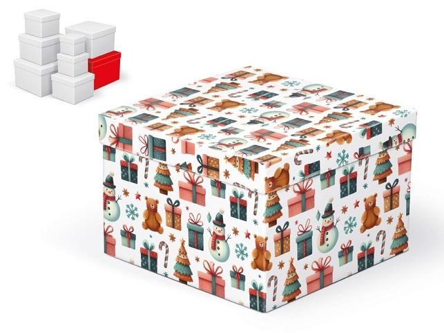 Vánoční dárková krabice o rozměrech 22 x 22 x 15 cm Vánoční dárková krabice je vyrobena z pevného kartonu a pokryta dekorativním papírem s vánočními motivy. Povrch krabice zdobí obrázky medvídků, dárků, vánočních stromečků, sněhuláků, cukrových hůlek a sněhových vloček. Barva pozadí je bílá, což vytváří krásný kontrast s barevnými motivy. Jejich slavnostní a elegantní vzhled je ideální pro balení vánočních dárků. Při vložení do košíku se automaticky vloží i ostatní krabičky, tak aby jste měli v košíku vždy celý, kompletní set. Materiál: 1,5 mm karton, potažený luxusním papírem SET OBSAHUJE TYTO KRABICE: 5371160 Krabice dárková C-V008-A 8x8x8 cm 5371161 Krabice dárková C-V008-B 10x10x9 cm 5371162 Krabice dárková C-V008-C 12x12x10 cm 5371163 Krabice dárková C-V008-D 14x14x11 cm 5371164 Krabice dárková C-V008-E 16x16x12 cm 5371165 Krabice dárková C-V008-F 18x18x13 cm 5371166 Krabice dárková C-V008-G 20x20x14 cm 5371167 Krabice dárková C-V008-H 22x22x15 cm Uvedená cena je za 1 ks.