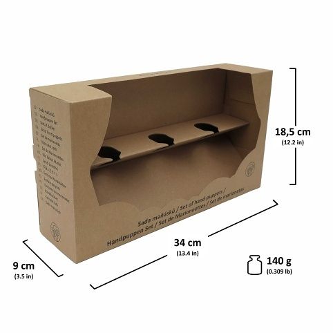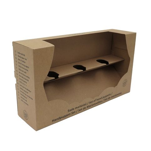 Kartonová krabička s potiskem, pro vytvoření dárkového balení tří maňásků z nabídku MUNABO, včetně vnitřní vložky pro fixaci hlaviček maňásků. Krabička není vhodná pro maňásky s nohama (řada 26xxx) a s rozměrnými hlavami (klobouk, rohy, apod.)