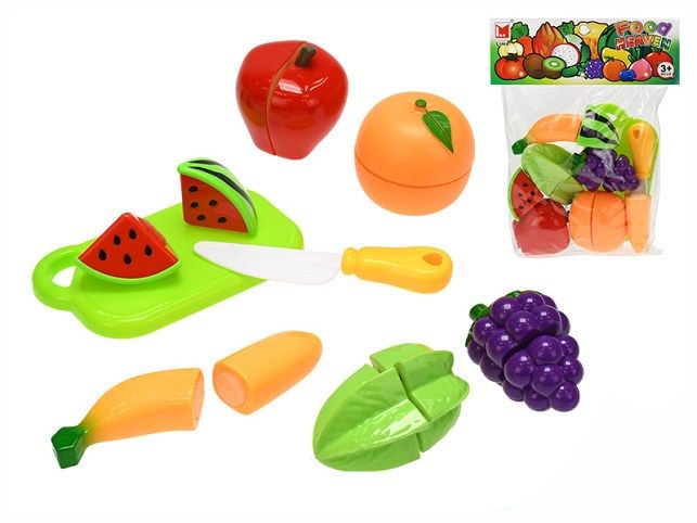 Plastové krájecí ovoce s deskou a nožem. Ovoce je složeno ze dvou kusů, které jsou spojeny suchým zipem. Sada obsahuje 8 různých druhů ovoce.