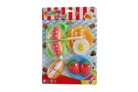 Sada krájení jídla. Obsahuje různé druhy jídla a nádobí. Potraviny jsou uvnitř spojeny suchým zipem, lze ho krájet (oddělovat) opakovaně. Děti se tak učí správnou motoriku. Rozměry balení cca 30 x 21 x 5 cm. Věk 3+