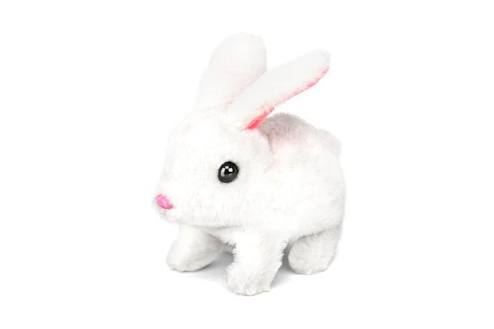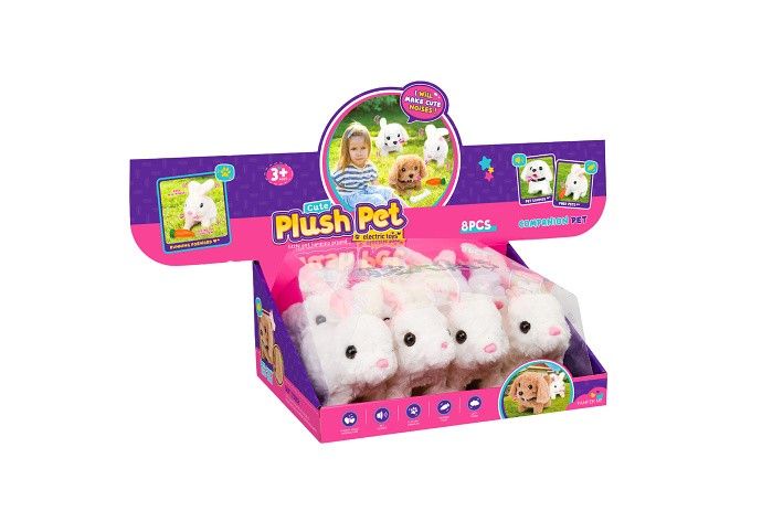 Králíček s efekty. Rozměry 16x9x12 cm. Pohybuje se a vydává zvukové efekty. Display box 8 ks. Baterie 2xAA, nejsou součástí.