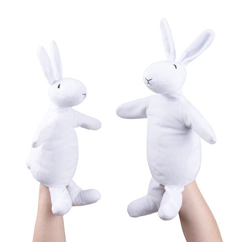 Bob a Bobek - králíci z klobouku jako maňásci na ruku. 2-dílná sada textilních postaviček z příjemně měkoučkého materiálu. Bob 42cm a Bobek 35cm.
