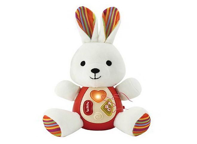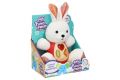 Králík interaktivní pro nejmenší s efekty. Rozměry 22,5x11,5x18,2 cm. ON/OFF přepínač na straně králíka. Plyšový s plastovým bříškem. Aktivace tlačítky na bříšku - světelné efekty, zvukové efekty a melodie. Baterie 2xAAA, nejsou součástí.