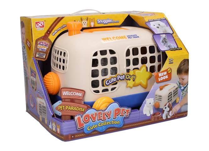 Králík v přepravce. Velikost 28 cm. Součástí je přepravka, plyšový králík a příslušenství: miska, vodítko, hřeben, mrkev. Při zatřesení vydává akustické zvukové efekty.