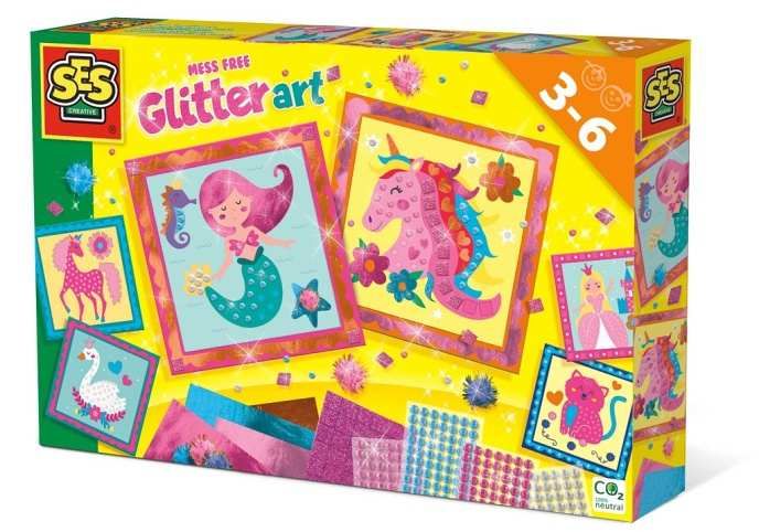 Tato kreativní sada od SES Creative umožňuje dětem vytvářet úžasné, třpytivé obrázky bez obvyklého nepořádku spojeného s volnými třpytkami!Sada obsahuje speciální samolepicí karty s motivy (např. jednorožec nebo mořská panna). Karty mají odnímatelnou horní vrstvu. Jednoduše sloupněte vrchní vrstvu z vybrané oblasti a na lepivý povrch aplikujte třpytivé materiály, jako je transferová fólie nebo pompony. Nechte hřívu jednorožce zazářit nebo dodejte mořské panně lesklý ocas!Sada obsahuje: Samolepicí karty: 6 předtištěných kartiček s motivy, které lze zdobit.Lesklá transferová fólie: 4 barvy lesklé transferové fólie pro vytváření hladkých, metalických efektů.Diamantové samolepky (Diamantové nálepky):84 růžových diamantových samolepek,84 modrých diamantových samolepek,84 stříbrných diamantových samolepek,84 světle růžových diamantových samolepek.Pěnové mozaikové třpytivé nálepky: Růžové třpytivé pěnové nálepky ve stylu mozaiky.Pompony: 10 pomponů ve 3 barvách.