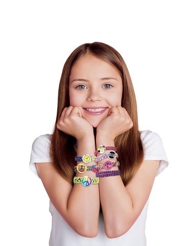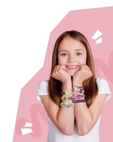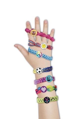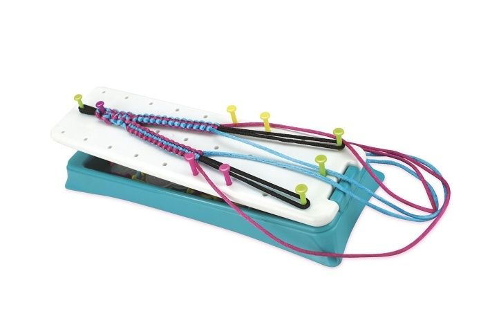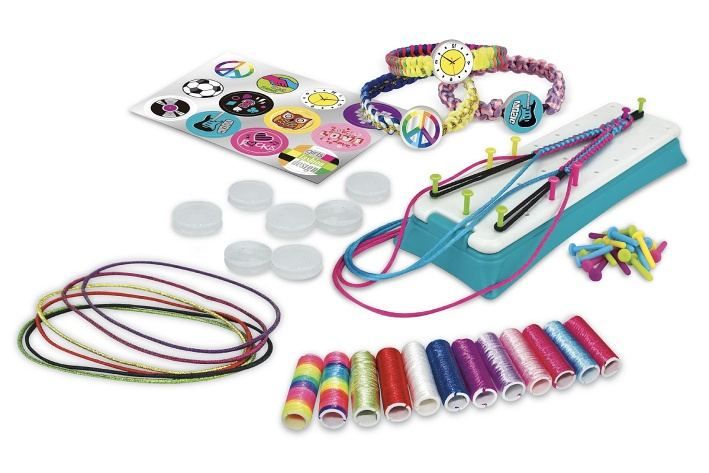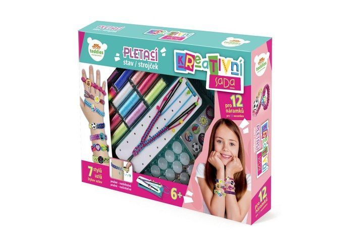 Kreativní sada obsahuje pletací stav, příze, spojovací knoflíčky a samolepky. Děti si mohou uplést 12 náramků a vybrat si mohou ze 7 stylů uzlů.