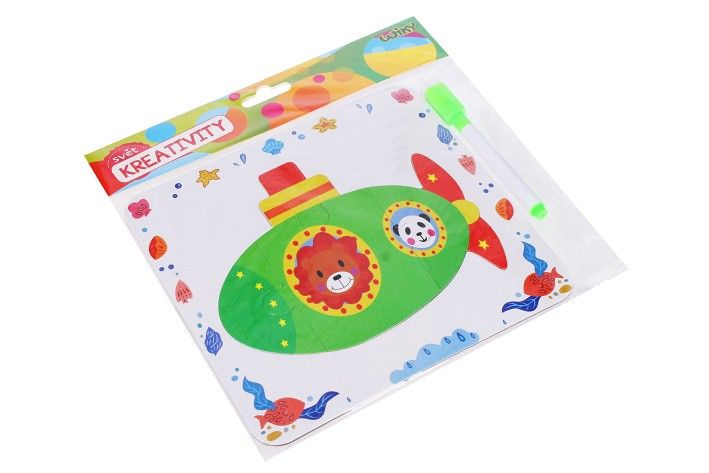 Jedna strana obsahuje puzzle a druhá strana tabulku, na které lze psát přiděleným fixem.