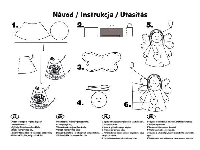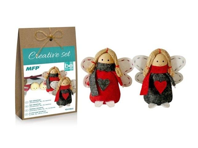 Kreativní set - andílek - Ušijte si s dětmi originální ozdobu, andílka. Děti si procvičí svoje prstíky a rozvinou kreativní myšlení. BALENÍ OBSAHUJE: - 2x dřevěná hlava - filc - niť - bavlnka - výplň - návod NÁVOD: 1/ Vložte do těla písek i výplň a sešíjte ho. 2/ Zkompletujte ruce. 3/ Vyšívejte dekoračním stehem křídla. 4/ Svažte vlasy červenou nití. 5/ Nalepte vlasy na hlavu, a tu pak přilepte k tělu i s křídly. 6/ Přilepte křídla, šálu, nohy a srdce k tělu. VAROVÁNÍ: Používejte pod dozorem dospělé osoby, obal odstraňte z dosahu dětí, není vhodné pro děti do 7 let, obsahuje malé části, nebezpečí spolknutí a udušení. Uvedená cena je za 1 balení.