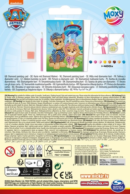 Kreativní set diamantové malování s motivem Paw Patrol/Tlapková patrola obsahuje přes 400 kamínků, obrázek k nalepení diamantů, pero k nabírání jednotlivých diamantů a obálku, do které můžeme hotový obrázek zabalit. Velké kameny/diamanty. 18x12,5 cm