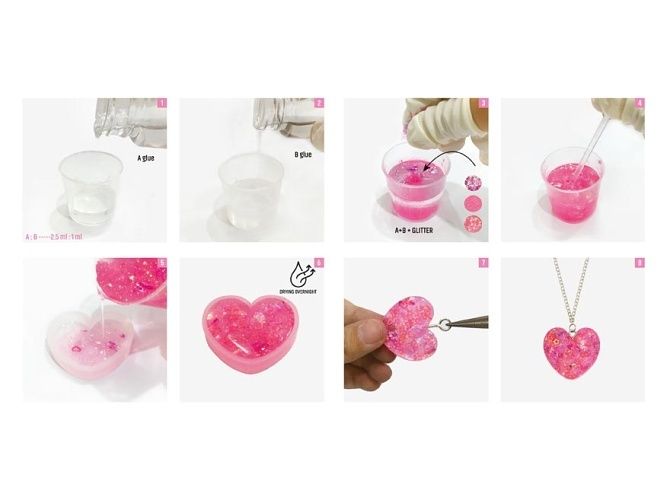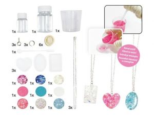 Kreativní set - epoxidové náhrdelníky BALENÍ OBSAHUJE: 2x lepidlo celkem 50 g 1x míchací tyčinka 3x silikonová forma 1x plastová odměrka 3x řetízek 3x šroubek s okem 3x kroužek 9x barevný glitter 6x návlek na prst 1x návod k použití VAROVÁNÍ: Nevhodné pro děti do 3 let. Obsahuje malé části, hrozí nebezpečí udušení! Uvedená cena je za 1 ks.