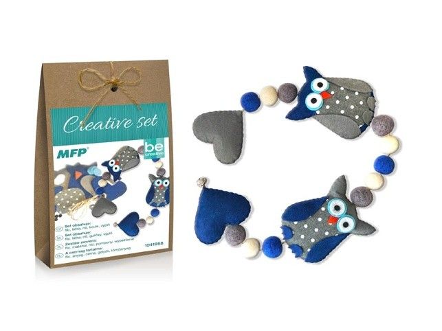 Kreativní set - girlanda s modrými sovičkami. Ušijte si s dětmi originální ozdobu se sovičkou a srdíčky. Děti si procvičí svoje prstíky a rozvinou kreativní myšlení. Ozdoba je v modro - šedé barvě. BALENÍ OBSAHUJE: - filc - látku - nit - koule - výplň - rolničku - návod NÁVOD: 1/ Vložte do srdcí výplň a sešijte je. 2/ Vložte do těl soviček výplň a sešijte je. 3/ Vyšívejte dekoračním stehem křídla. 4/ Přilepte oči, nos, křídla, látku a nohy k tělu. 5/ Potřete polystyrenové koule lepidlem a obalte je plstí. 6/ Protáhněte jehlu se šňůrou skrz srdíčka, sovičky i koule, aby vznikl řetěz. 7/ Na jeden konec šňůry přivažte rolničku a na druhém konci vytvořte smyčku. VAROVÁNÍ: Používejte pod dozorem dospělé osoby, obal odstraňte z dosahu dětí, není vhodné pro děti do 7 let, obsahuje malé části, nebezpečí spolknutí a udušení. Uvedená cena je za 1 ks.