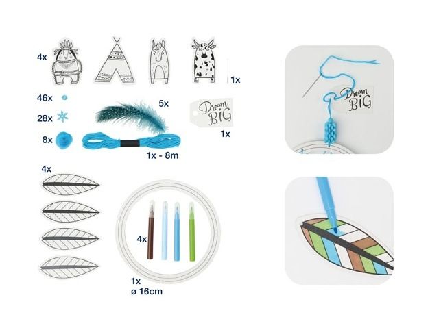 Balení obsahuje: tělo lapače snů O 16 cm, 4ks fixů, jehla, 4x papírový lísteček, 4x indiánský motiv, 5x modré pírko, 1x bavlnka, 74ks plastových korálků, 8x modrá bambulka, manuál Vše je baleno v dárkové krabičce se závěsem. VAROVÁNÍ: Používejte pod dozorem dospělé osoby, obal odstraňte z dosahu dětí, není vhodné pro děti do 3 let, obsahuje malé části, nebezpečí spolknutí a udušení.