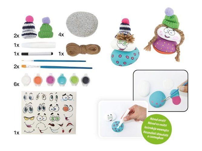 Kreativní set - malování kamínků II BALENÍ OBSAHUJE: 6x akrylová barva, 2x štětec 1x popisovač 1x lepidlo 4x kamínek 2x čepice 1x provázek 1x samolepky 1x návod k použití VAROVÁNÍ: Nevhodné pro děti do 3 let. Obsahuje malé části, hrozí nebezpečí udušení! Uvedená cena je za 1 ks.