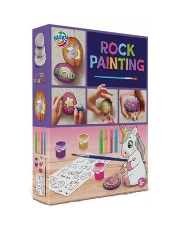 Kreativní set malování a zdobení kamínků jednorožec, balení obsahuje 3 kamínky, 3 barvy, 4 perlová lepidla, stětec a list předloh, 21x15,5 cm