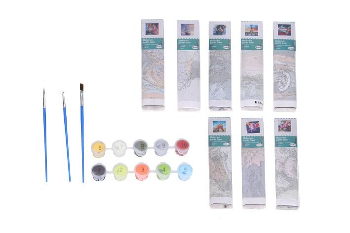 Uvnitř balení: 1x plátno, 1x sada barev, 3x štětec, návod.