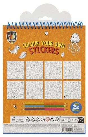 Kreativní set vymaluj si své samolepky ve formě kroužkového bloku obsahuje 8 listů samolepek k vymalování a 3 oboustranné pastelky (6 barev), vybarvi a nalep!