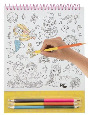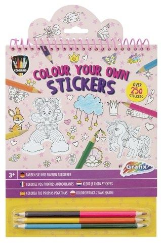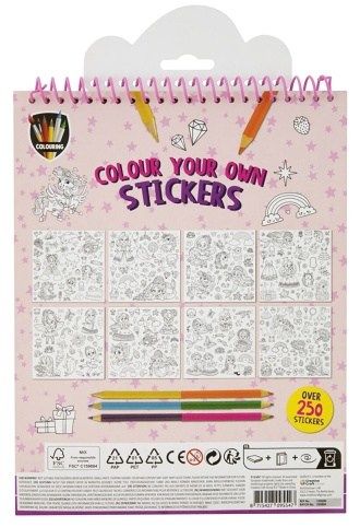 Kreativní set vymaluj si své samolepky ve formě kroužkového bloku obsahuje 8 listů samolepek k vymalování a 3 oboustranné pastelky (6 barev), vybarvi a nalep!