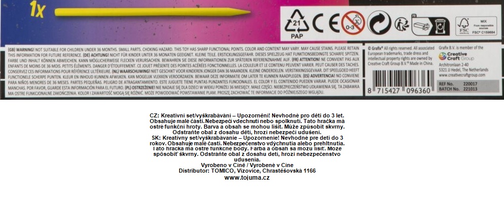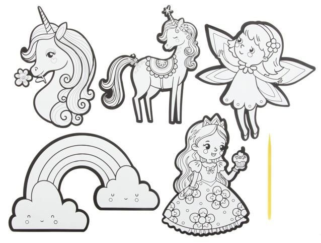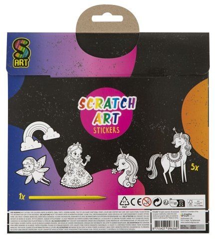 Kreativní set obsahuje 5 kusů vyškrabávacích samolepek a vyškrabávací pero, velikost samolepky je cca 15 cm
