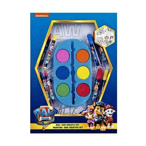 Když pastelky začnou nudit, přichází na řadu barvy a štětce. Menší malířská sada s motivem Paw Patrol obsahuje 6 barvicích listů, 4 pastelky, 3 fixy, 6 akvarelů s paletou a 1 štětec.