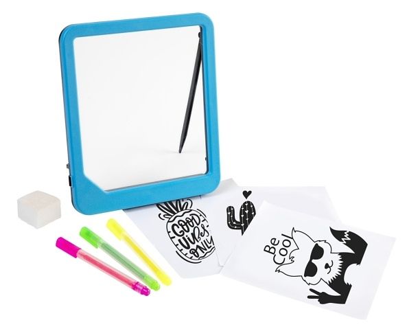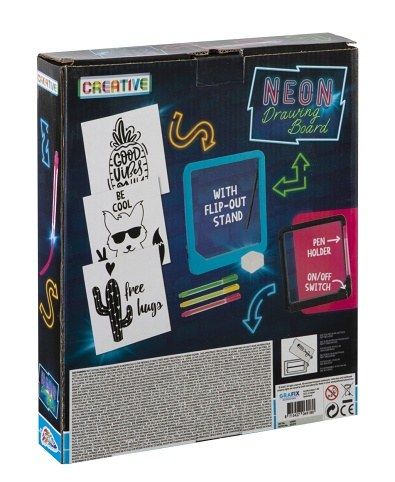 Se svítící neonovou tabulkou můžete kreslit i ve tmě, součástí balení jsou neonové fixy, které promění kresby ve tmě v magické obrázky. Na kreslící tabulce je i držák na tužku. Balení obsahuje kreslící tabulku s držáke na tužku, 3 fixy v neonových barvách (růžová, žlutá a zelená), šablony s omalovávankami a houbičku na mazání.