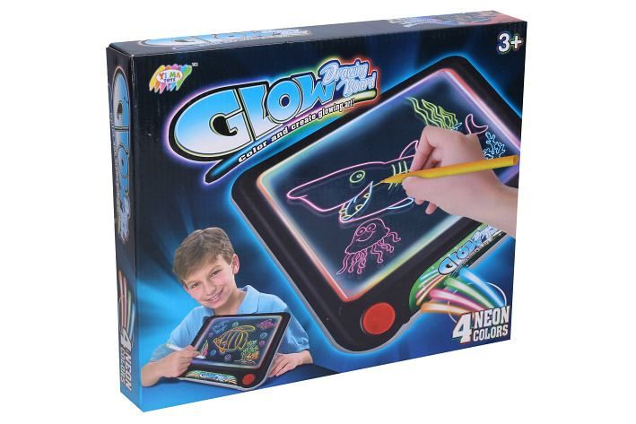 Kreslící tabulka svítící. 3xAAA baterie nejsou součástí. Velikost 25,5x23,5x3,5 cm. Návod na krabici. Obsahuje: mazací fixy, hadřík na mazání, šablony.
