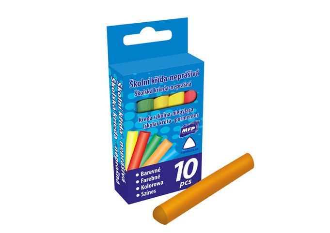 Trojhranná školní křída neprášivá - rúzné barvy - určena pro psaní na školní tabuli, ale i pro psaní na chodník či zídky. Křídy jsou vysoce odolné vůči zlomení a zajišťují hladké psaní při použití na tabulích. Balení obsahuje: 2 ks žluté křídy 2 ks modré křídy 2 ks zelené křídy 2 ks oranžové křídy 2 ks růžové křídy Uvedená cena je za 1 balení, ve kterém se nachází 10 ks bílých kříd. Křídy jsou uloženy v papírové krabičce s eurozávěsem. Rozměr křídy: 8 x 1 x 1 cm