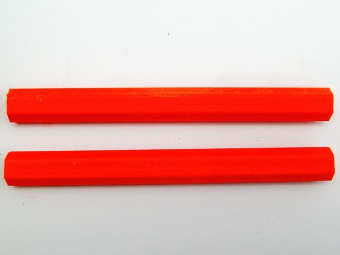Fluorescenční šestihranná lesnická křída OK 10,5 mm, délka 115 mm se používá pro značení na pilách vybavených optickým snímáním značení. Tento typ je vhodný především na suché dřevo.