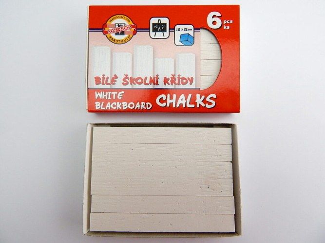 Sada křídy školní bílé 6. Sada 6 kusů školních bílých čtyřhranných kříd o rozměrech 12x12x100 mm, které jsou určeny pro psaní na školní tabule, vložených do krabičky s potištěnou manžetou a eurozávěsem. Upozornění. Nevhodné pro děti do 3 let. Možnost odlomení malých částí. Nebezpečí zalknutí.