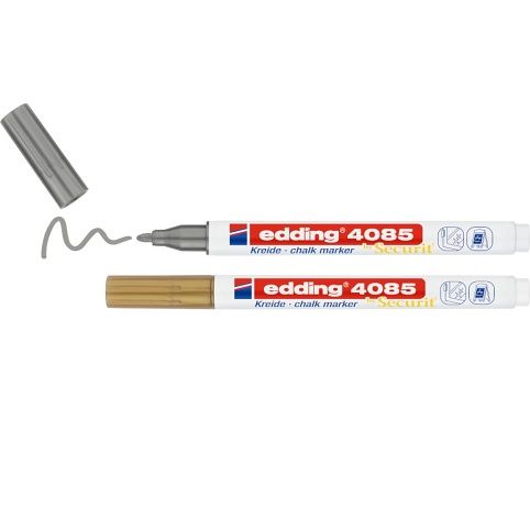 Krídový popisovac edding 4085 je nepermanentní fix ve forme tekuté krídy. Tenký hrot nabízí cistou precizní stopu. Inkoust na bázi vody vyniká vysokou krycí schopností, proto je napsaná stopa velmi dobre videt. Krídový popisovac lze využít k psaní na okna, skla, plexiskla, zrcadla a tmavé tabule. Inkoust se dá smýt ze všech neporézních materiálu vlhkým hadríkem. Tekutá krída edding je oblíbená v hotelích, restauracích, barech a zároven ve sklárském prumyslu. Využívá se také ke zdobení a popisování oken v domácnostech a v kancelárích. Neonové barvy jsou viditelné pod UV svetlem. Tok inkoustu je rízen ventilem, a proto je pred prvním použitím potreba popisovac protrepat, sejmout vícko a lehkým pumpováním umožnit inkoustu stéci do hrotu. Skladujte ve vodorovné poloze. Sada 2 barev: zlatá a stríbrná. Kulatý hrot. Šíre stopy: 1-2 mm.