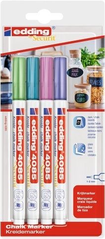 Křídový popisovač edding 4085 Metallic, sada 4 ks je nepermanentní fix ve formě tekuté křídy. Tenký hrot nabízí čistou precizní stopu. Inkoust na bázi vody vyniká vysokou krycí schopností, proto je napsaná stopa velmi dobře vidět. Křídový popisovač lze využít k psaní na okna, skla, plexiskla, zrcadla a tmavé tabule. Inkoust se dá smýt ze všech neporézních materiálů vlhkým hadříkem. Tekutá křída edding je oblíbená v hotelích, restauracích, barech a zároveň ve sklářském průmyslu. Využívá se také ke zdobení a popisování oken v domácnostech a v kancelářích. Neonové barvy jsou viditelné pod UV světlem. Tok inkoustu je řízen ventilem, a proto je před prvním použitím potřeba popisovač protřepat, sejmout víčko a lehkým pumpováním umožnit inkoustu stéci do hrotu. Skladujte ve vodorovné poloze. Sada 4 barev: malinová (061), neonově žlutá (065), neonově oranžová (066), neonově růžová (069). Kulatý hrot. Šíře stopy: 1-2 mm.
