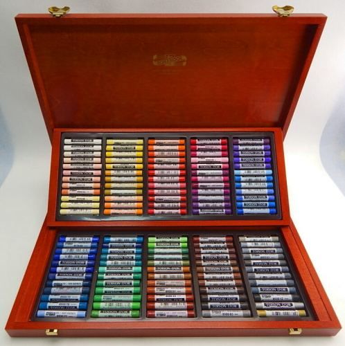 Souprava 120 ks kulatých uměleckých pastelů s ovinem o průměru 10 mm a délce 75 mm v patrové dřevěné kazetě. Pastely mají vynikající psací vlastnosti i světlostálost. Kresbu doporučujeme po dokončení stabilizovat fixativem.