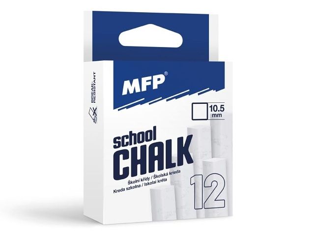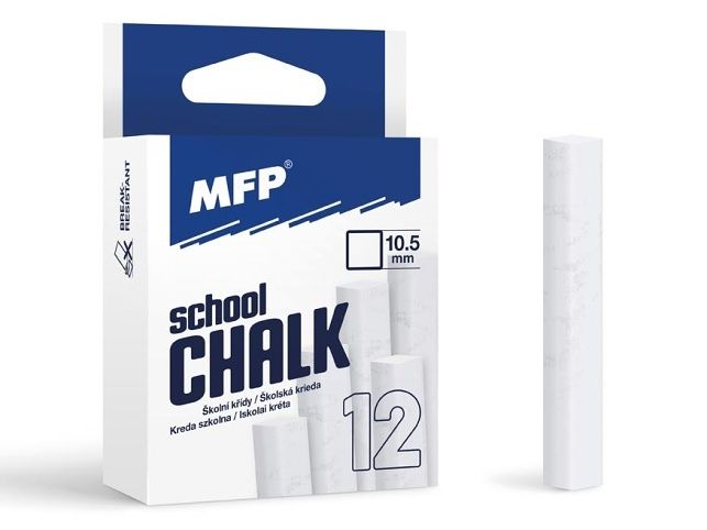 Čtyřhranná školní křída neprášivá, bílá - určena pro psaní na školní tabuli, ale i pro psaní na chodník či zídky Křídy jsou vysoce odolné vůči zlomení a zajišťují hladké psaní při použití na tabulích. Uvedená cena je za 1 balení, ve kterém se nachází 12 ks bílých kříd. Křídy jsou uloženy v papírové krabičce s eurozávěsem.
