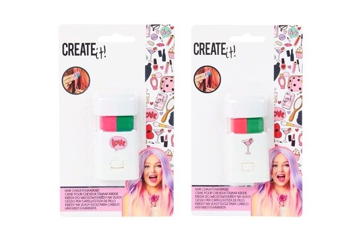 Jsi připravená na novou barvu vlasů? Neboj se, je to jen dočasné! Křídy na vlasy od Create it! dodají tvému účesu zářivé barvy, které snadno vymyješ jednoduše umytím vlasů.Stačí křídu nanést a během chvilky máš nový barevný look. Můžeš si dokonce vytvořit vlastní vzor či barevnou kombinaci a překvapit kamarádky originálním účesem, který nikdo nepřehlédne.Křídy na vlasy jsou k dispozici ve dvou barevných kombinacích: růžová/zelená a růžová/modrá. Produkty jsou dermatologicky testované, bez parabenů a nejsou testované na zvířatech, takže jsou bezpečné a vhodné pro dívky ve věku 6–14 let. Balení je vyrobeno ze 100% recyklovatelného PET a FSC certifikovaného papíru a hravý design podporuje kreativitu a sebevyjádření.