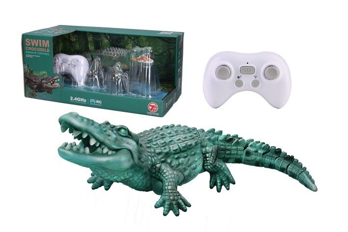 Krokodýl RC na dálkové ovládání. Rozměry 35x15x8 cm. Frekvence 2. 4GHz. Světelné efekty očí. 3. 7V bateriový pack do krokodýla součástí, 2xAA do ovladače nejsou součástí. USB adaptér součástí. Ovladač - tlačítko ON/OFF, levé kulaté tlačítko - demo režim, pravé kulaté tlačítko - programování. Senzory na vodu na spodní straně krokodýla.