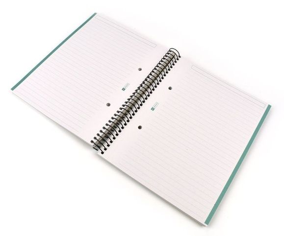 Ekologicky šetrný poznámkový blok z recyklovaného papíru v pevném kartonovém obalu s kroužkovou vazbou.