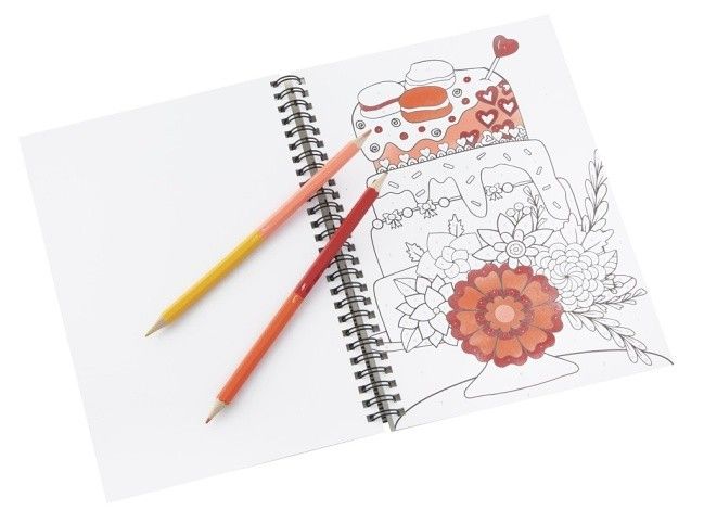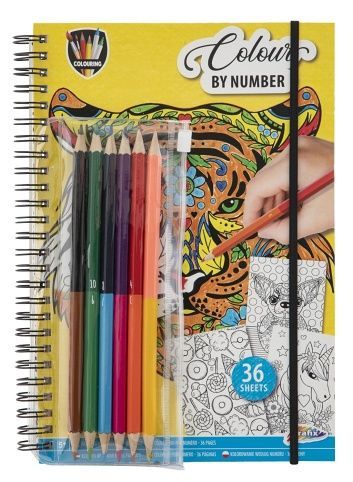 Kroužkový blok vymalovánek podle čísel s pastelkami. Vymalovánky obsahují 36 listů – 23×16 cm a 6 oboustranných pastelek.