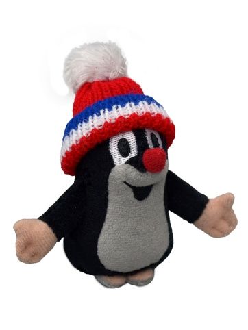 Plyšový Krteček se sundávacím kulichem v barvě červené trikolory.