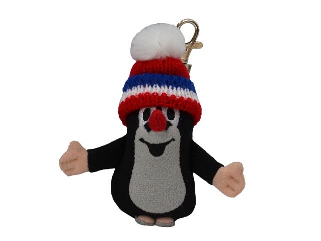 Plyšový přívěsek na kovové karabině. Krteček s kulichem v barvě trikolóry červené.