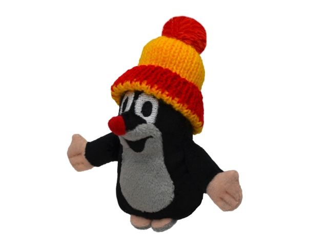 Krtek 10 cm, kulich červeno-žlutý, plyšový přívěsek na karabince