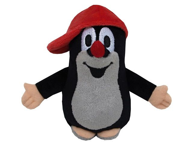 Plyšový Krteček s kšiltovkou.