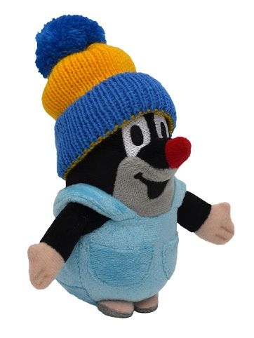 Plyšový Krteček v kalhotkách s kapsami a sundavacím pleteným kulichem.