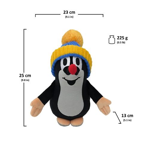 Roztomilý plyšový Krteček se sundavací pletenou čepičkou. Nejenže je měkoučký a hebký, ale díky naplnění drobnými fazolkami v dolní části podporuje rozvoj smyslového vnímání a hmatových dovedností vašeho dítěte, a také díky nim lépe stojí.