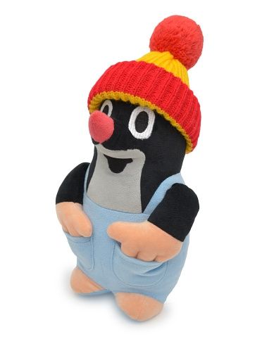 Plyšový Krteček v kalhotkách s kapsami, sundavacím pleteným kulichem.