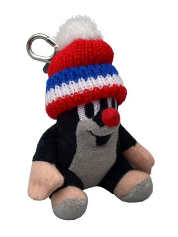 Plyšový přívěsek na kovové karabině. Krteček sedící s kulichem v červené trikoloře.