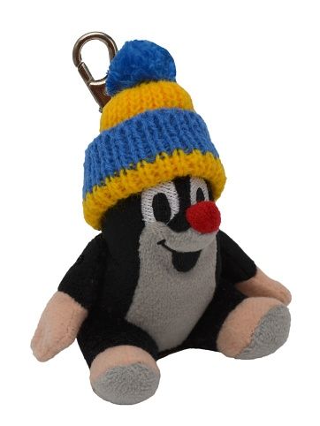 Plyšový přívěsek na kovové karabině. Krteček sedící s modro-žlutým kulichem.