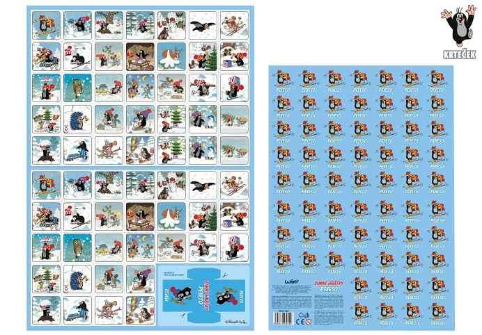 Krtek Pexeso vystřihovací, zimní hrátky. 32 párů. Na archu krabička k vystřižení. Rozměry jednotlivých kartiček 48x48 mm. Papír 400g